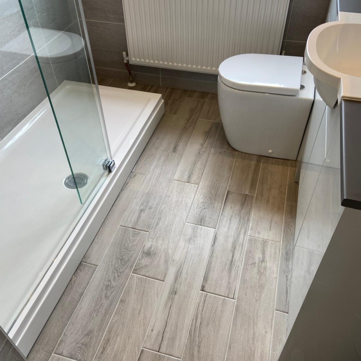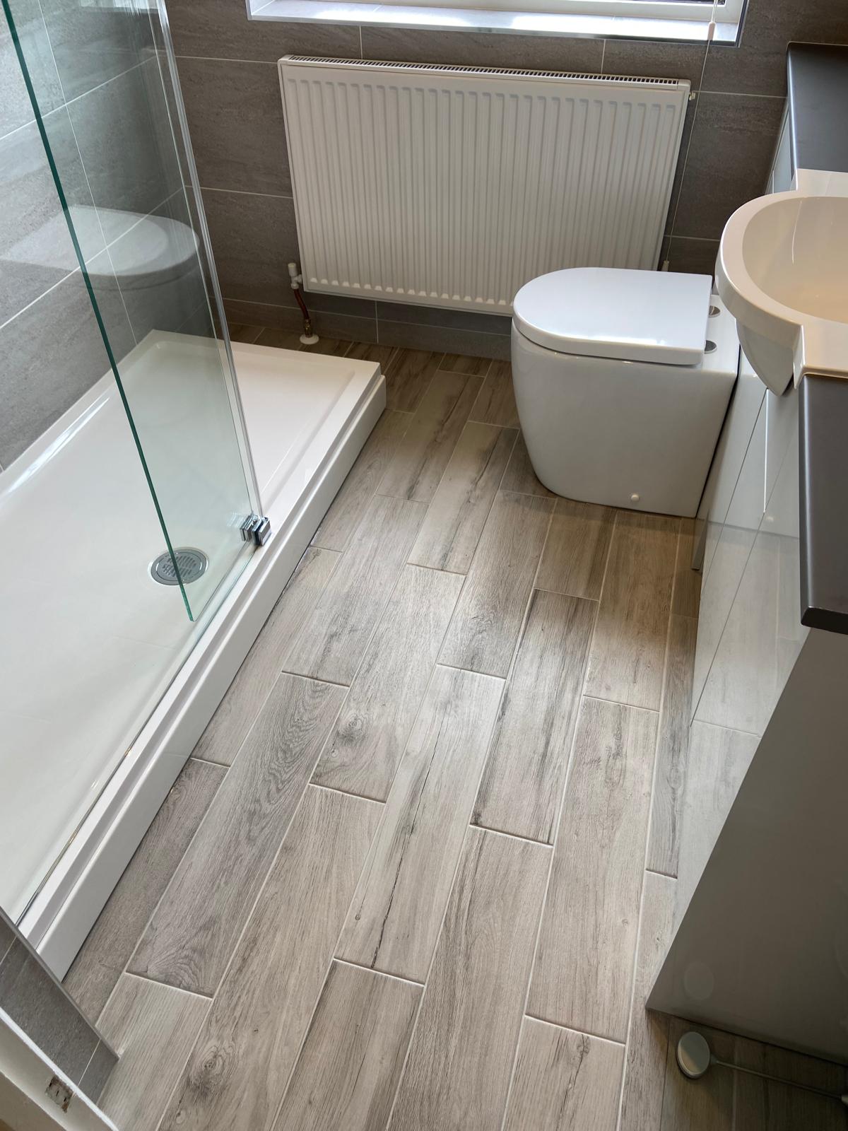 Porcelanosa tiles were used on the walls & plank floor tiles were used to finish the look. Grout used in a matching colour with silver trims on all external edges.